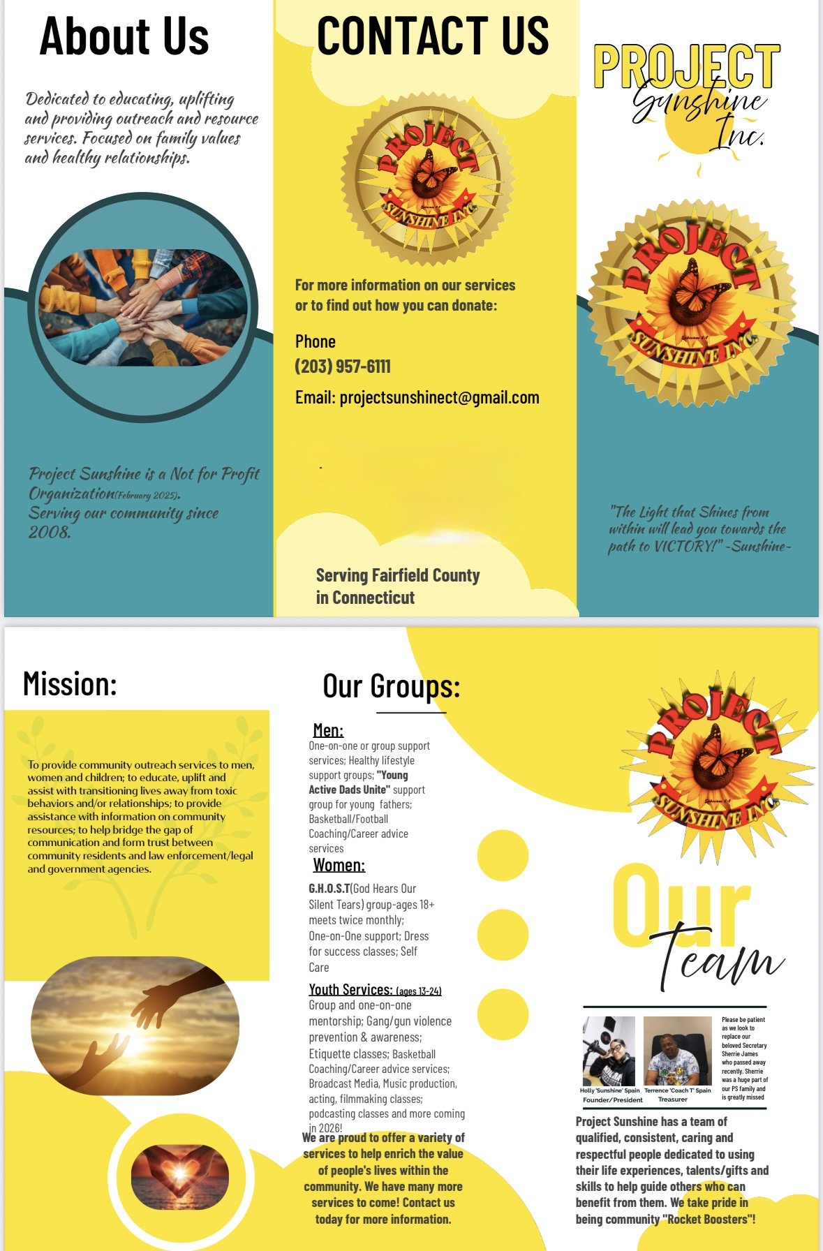 Project Sunshine is a Non-Profit 501(c)(3) Organization that is committed to providing community outreach services. Project Sunshine was birthed in 2008 as an ‘out of pocket’ ministry and has dedicated many hours of work touching the lives of residents in Bridgeport, CT. Project Sunshine decided to obtain it’s Not for Profit status February 2025 with hopes to be able to reach more people within Fairfield County.